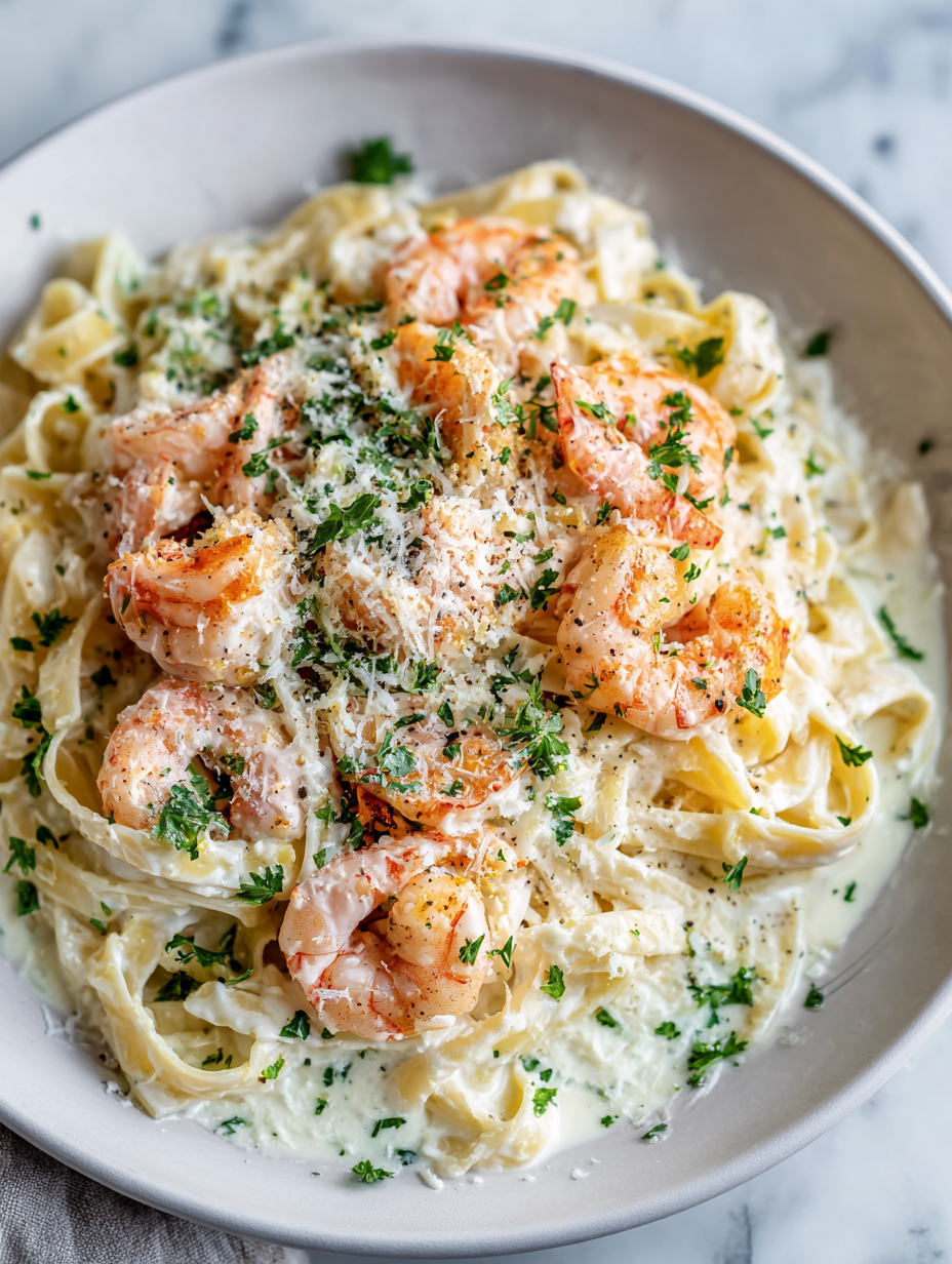 Shrimp Fettuccine Alfredo is a creamy pasta dish featuring tender shrimp coated in a silky, velvety Alfredo sauce that clings perfectly to each strand of fettuccine. The process involves cooking pasta al dente, sautéing shrimp until just pink, and creating a rich sauce by emulsifying cream, cheese, and garlic for a luxurious finish. The final dish boasts a smooth, glossy appearance with shrimp and pasta evenly coated, ready to serve hot and indulgent.
